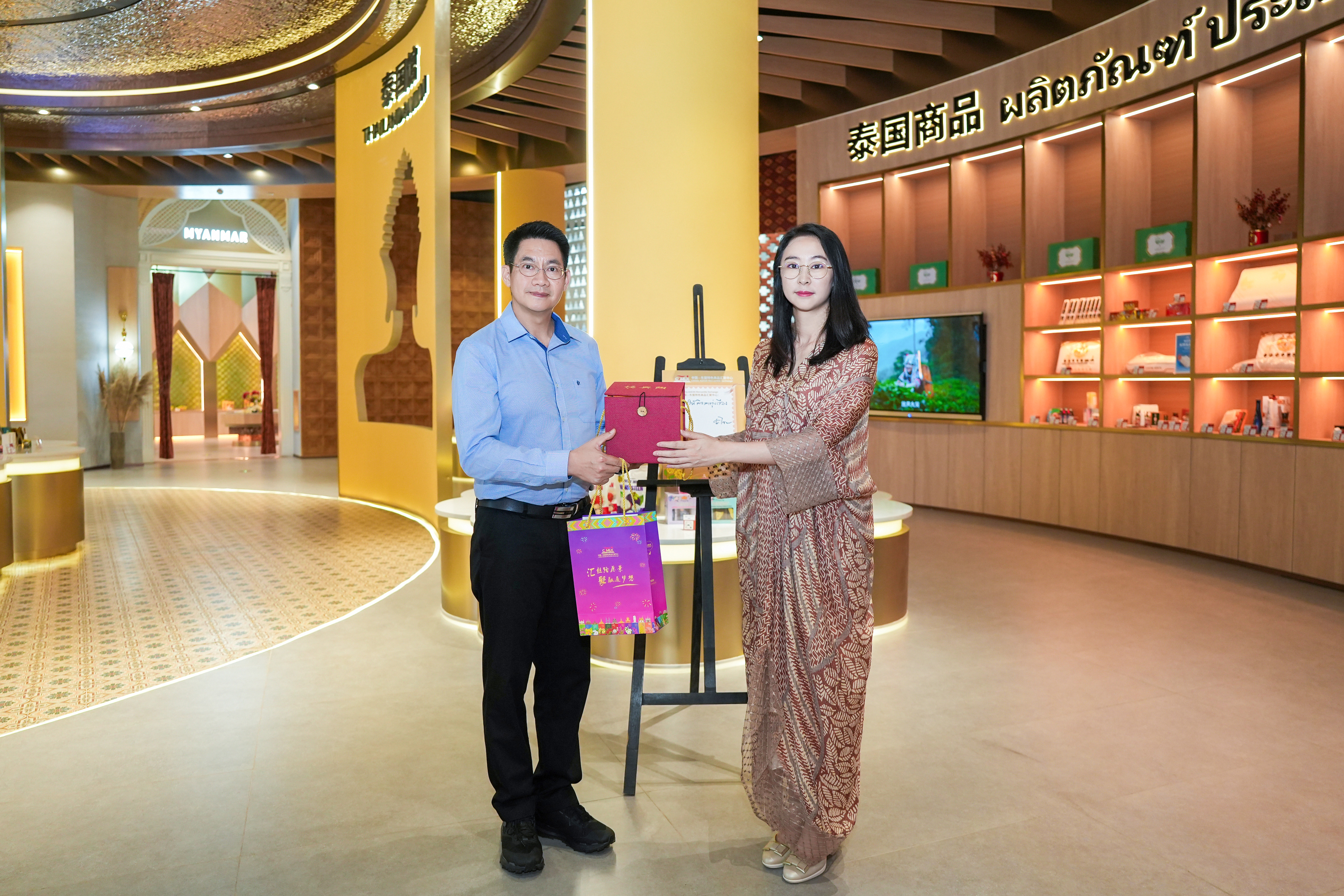 步入泰國館,館內(nèi)琳瑯滿目的商品及當(dāng)?shù)馗鞣N特色文化元素的創(chuàng)意呈現(xiàn),讓代表團產(chǎn)生了濃厚的興趣。在了解到匯聚中心為入駐商家提供一站式增值服務(wù),特別是聽取了各館長對商品專業(yè)的介紹后,代表團對平臺的發(fā)展更添信心。“這是一個真正為商家服務(wù)并獨具特色的商貿(mào)平臺,很開心能在這里看到很多泰北特色商品,泰北的清邁、清萊和蘭納地區(qū)擁有非常豐富的手工藝品,如咖啡、陶瓷、木雕、雨傘、燈籠等,希望能在匯聚中心設(shè)立泰北特色商品專區(qū),借助匯聚中心這一平臺幫助當(dāng)?shù)靥厣唐窋U大品牌影響力,拓寬國際市場”。代表團興致高漲,隨即就商品入駐流程與后續(xù)營銷推廣細節(jié),與匯聚中心團隊展開積極溝通。